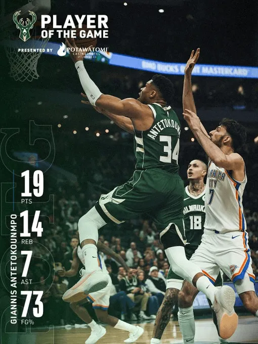 赛后,雄鹿官方发布扬尼斯-阿德托昆博数据海报,并配文道:“队内最佳球员。”